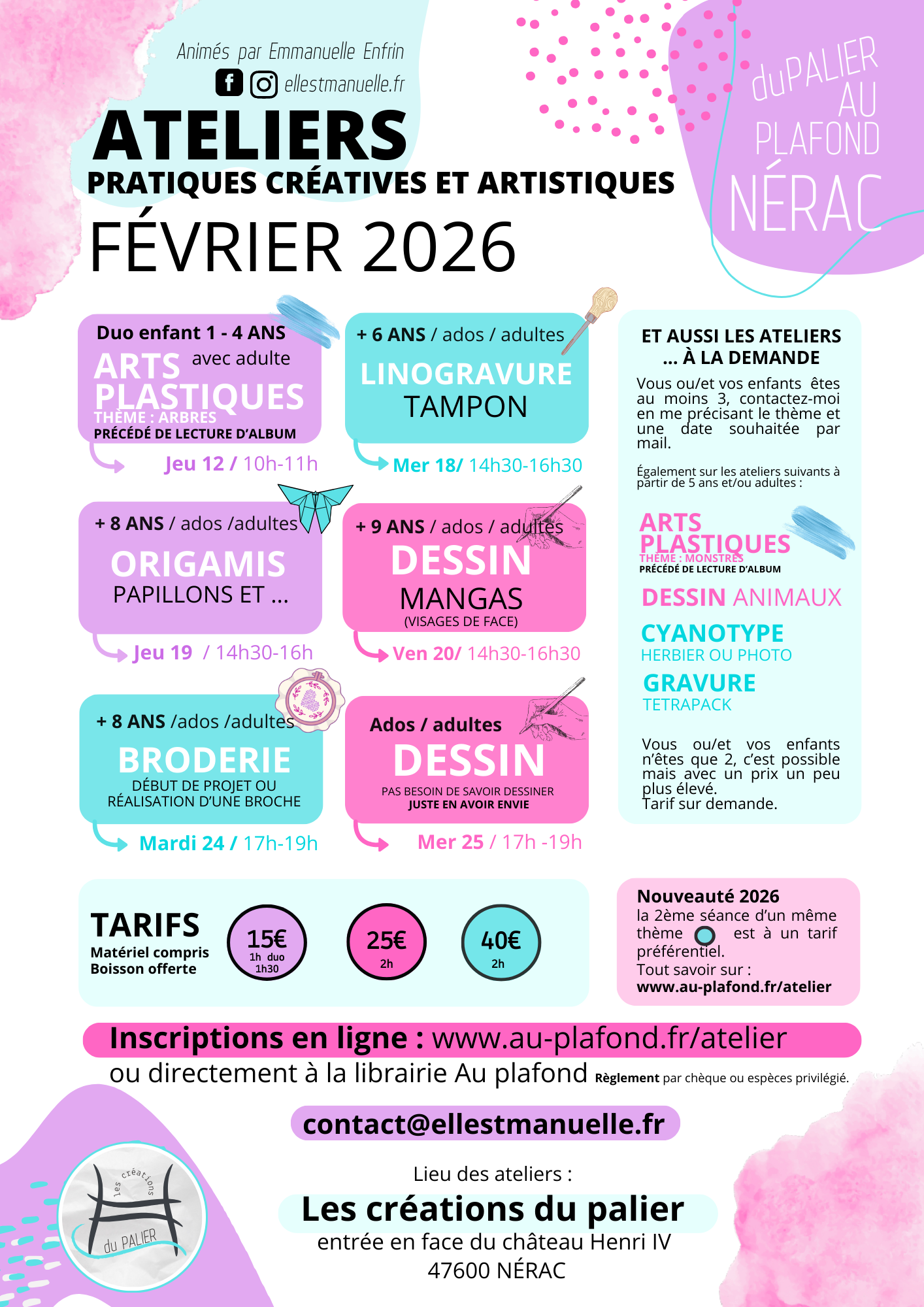 Tarifs et inscriptions pour chaque période de vacances scolaires: ici en ligne ou directement à la librairie.