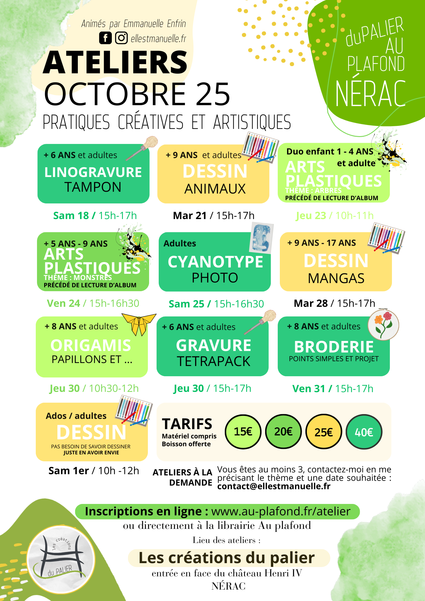 La balade vous sera agréable.Au palier, l’atelier installé à Nérac, rue Henri IV en face du château, est votre nouvelle étape artistique dans laquelle nous mettrons à profit nos échanges pour que vous puissiez créer vos propres œuvres, pour que vos créations prennent vie.